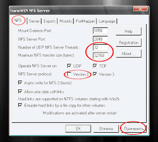 - далее выполняем основную настройку. Сначала на вкладке NFS убираем флажок напротив Version 2, затем меняем значение Number of UDP NFS Server Threads на 32, а Maximum NFS transfer size на 32768 (после внесения изменений не забудьте нажать кнопку Применить;