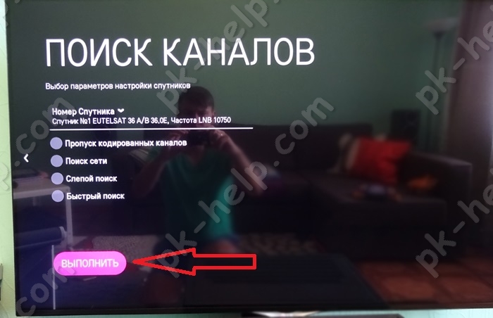 Следующим шагом, нажмите «Выполнить» что бы запустить поиск каналов. Так же можно указать более точный поиск выбрав, например — Пропуск кодированных каналов и т.д.