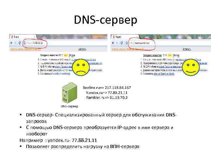 DNS-сервер • DNS-сервер- Специализированный сервер для обслуживания DNSзапросов • С помощью DNS-сервера преобразуется IP-адрес в имя сервера и наоборот Например : yandex. ru- 77. 88. 21. 11 • Позволяет распределить нагрузку на ВПН-сервера