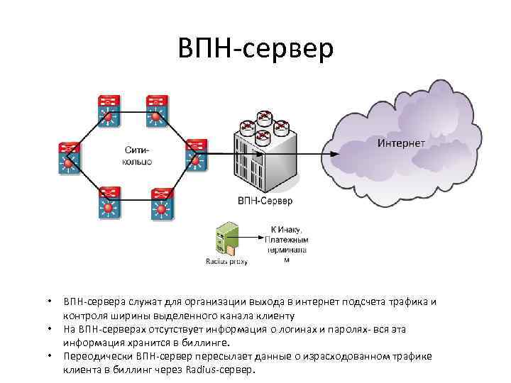 ВПН-сервер • • • ВПН-сервера служат для организации выхода в интернет подсчета трафика и контроля ширины выделенного канала клиенту На ВПН-серверах отсутствует информация о логинах и паролях- вся эта информация хранится в биллинге. Переодически ВПН-сервер пересылает данные о израсходованном трафике клиента в биллинг через Radius-сервер.