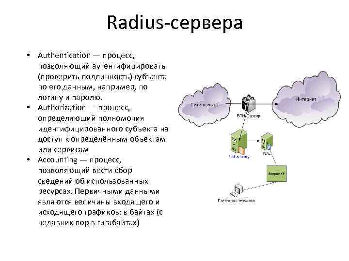 Radius-сервера • Authentication — процесс, позволяющий аутентифицировать (проверить подлинность) субъекта по его данным, например, по логину и паролю. • Authorization — процесс, определяющий полномочия идентифицированного субъекта на доступ к определённым объектам или сервисам • Accounting — процесс, позволяющий вести сбор сведений об использованных ресурсах. Первичными данными являются величины входящего и исходящего трафиков: в байтах (с недавних пор в гигабайтах)