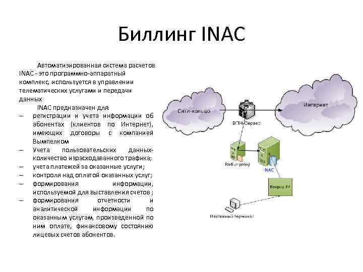 Биллинг INAC Автоматизированная система расчетов INAC — это программно-аппаратный комплекс, используется в управлении телематических услугами и передачи данных INAC предназначен для: — регистрации и учета информации об абонентах (клиентов по Интернет), имеющих договоры с компанией Вымпелком — Учета пользовательских данныхколичество израсходаванного трафика; — учета платежей за оказанные услуги; — контроля над оплатой оказанных услуг; — формирования информации, используемой для выставления счетов ; — формирования отчетности и аналитической информации по оказанным услугам, произведенной по ним оплате, финансовому состоянию лицевых счетов абонентов.