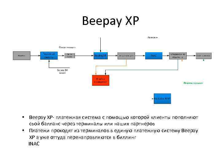 Beepay XP • Beepay XP- платежная система с помощью которой клиенты пополняют свой балланс через терминалы или наших партнеров • Платежи проходят из терминалов в единую платежную систему Beepay XP а уже оттуда перенаправляются в биллинг INAC