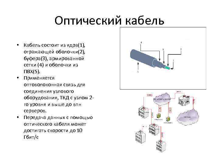 Оптический кабель • Кабель состоит из ядра(1), отражающей оболочки(2), буфера(3), армированной сетки (4) и оболочки из ПВХ(5). • Применяется оптоволоконная связь для соединения узлового оборудования, ТКД с узлом 2 го уровня и выше до впн серверов. • Передача данных с помощью оптического кабеля может достигать скорости до 10 Гбит/с