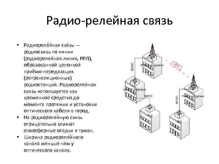 Радио-релейная связь • Радиореле йная свя зь — радиосвязь по линии (радиорелейная линия, РРЛ), образованной цепочкой приёмо-передающих (ретрансляционных) радиостанций. Радиорелейная связь используется как временное средство до момента протяжки и установки оптического кабеля в город. • На радиорелейную связь отрицательно влияют атмосферные осадки и туман. • Ширина радиорелейного канала меньше чем у оптического канала.
