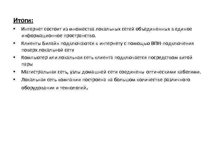 Итоги: • • • Интернет состоит из множества локальных сетей объединенных в единое информационное пространство. Клиенты Билайн подключаются к интернету с помощью ВПН-подключения поверх локальной сети Компьютер или локальная сеть клиента подключается посредством витой пары Магистральная сеть, узлы домашней сети соединены оптическими кабелями. Локальная сеть компании построена на большом количестве различного оборудования и технологий.