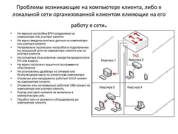 Проблемы возникающие на компьютере клиента, либо в локальной сети организованной клиентом влияющие на его работу в сети • • • Не верные настройки ВПН-соединения на компьютере или роутере клиента Не верно введены учетные данные на компьютере или роутере клиента Неправильно прописаны настройки в подключении по локальной сети на компьютере клиента или на роутере клиента На копьютере пользователя находится вредоносное ПО или вирусы Не верно настроено защитное программное обеспечение Не установлены драйвера на сетевую или беспроводную карту на клиентском компьютере Отключен или некорректно работает DHCP-клиент на компьютере клиента Отключен или не правильно работает DNS-клиент на компьютере или роутере клиента. Роутер или свитч клиента не включены в электрическую сеть Перебит патч от активного оборудования до компьютера клиента .