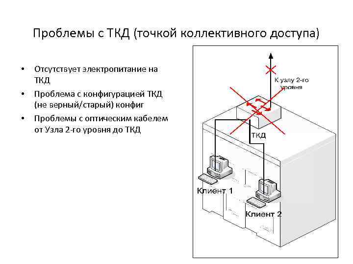 Проблемы с ТКД (точкой коллективного доступа) • • • Отсутствует электропитание на ТКД Проблема с конфигурацией ТКД (не верный/старый) конфиг Проблемы с оптическим кабелем от Узла 2 -го уровня до ТКД