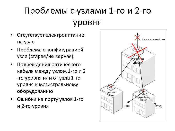 Проблемы с узлами 1 -го и 2 -го уровня • Отсутствует электропитание на узле • Проблема с конфигурацией узла (старая/не верная) • Повреждения оптического кабеля между узлом 1 -го и 2 -го уровня или от узла 1 -го уровня к магистральному оборудованию • Ошибки на порту узлов 1 -го и 2 -го уровня