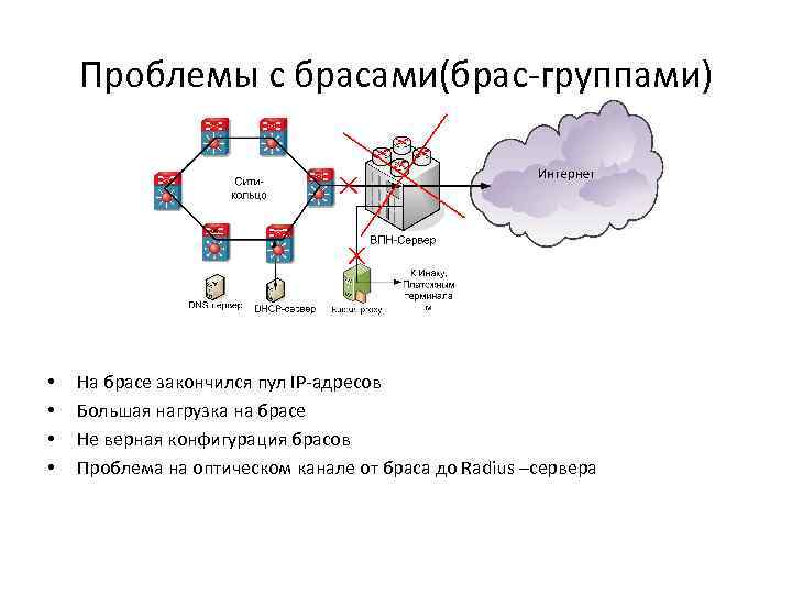 Проблемы с брасами(брас-группами) • • На брасе закончился пул IP-адресов Большая нагрузка на брасе Не верная конфигурация брасов Проблема на оптическом канале от браса до Radius –сервера