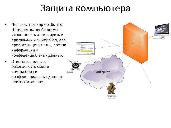 Защита компьютера • • Пользователю при работе с Интернетом необходимо использовать антивирусные программы и файерволл, для предотвращения атак, потери информации и конфеденциальных данных. Ответственность за безопасность своего компьютера и конфеденциальных данных несет сам клиент