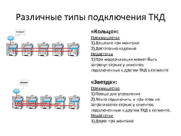 Различные типы подключения ТКД «Кольцо» : Преимущества 1) Дешевле при монтаже 2) Достаточно надежно Недостатки 1) При модернизации может быть затронут сервис у клиентов подключенных к другим ТКД в сегменте «Звезда» : Преимущества 1) Проще для управления 2) Лекго подключить и при этом не затрагивается сервис у клиентов подключенным к другим ТКД в сегменте. Недостатки 1) Дорог при монтаже