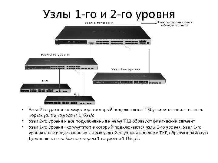 Узлы 1 -го и 2 -го уровня • • • Узел 2 -го уровня- коммутатор в который подключаются ТКД, ширина канала на всех портах узла 2 -го уровня 1 Гбит/с Узел 2 -го уровня и все подключенные к нему ТКД образуют физический сегмент Узел 1 -го уровня –коммутатор в который подключаются узлы 2 -го уровня, Узел 1 -го уровня и все подключенные к нему узлы 2 -го уровня а далее и ТКД образуют районую Домашнюю сеть. Все порты узла 1 -го уровня 1 Гбит/с.