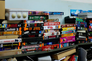 Но вернемся к устройству. При подключении и выбора устройства ввода на экране телевизора, появляется привычный фон воспроизведения видеокассет. Кассету берем с заранее собранной полочки.