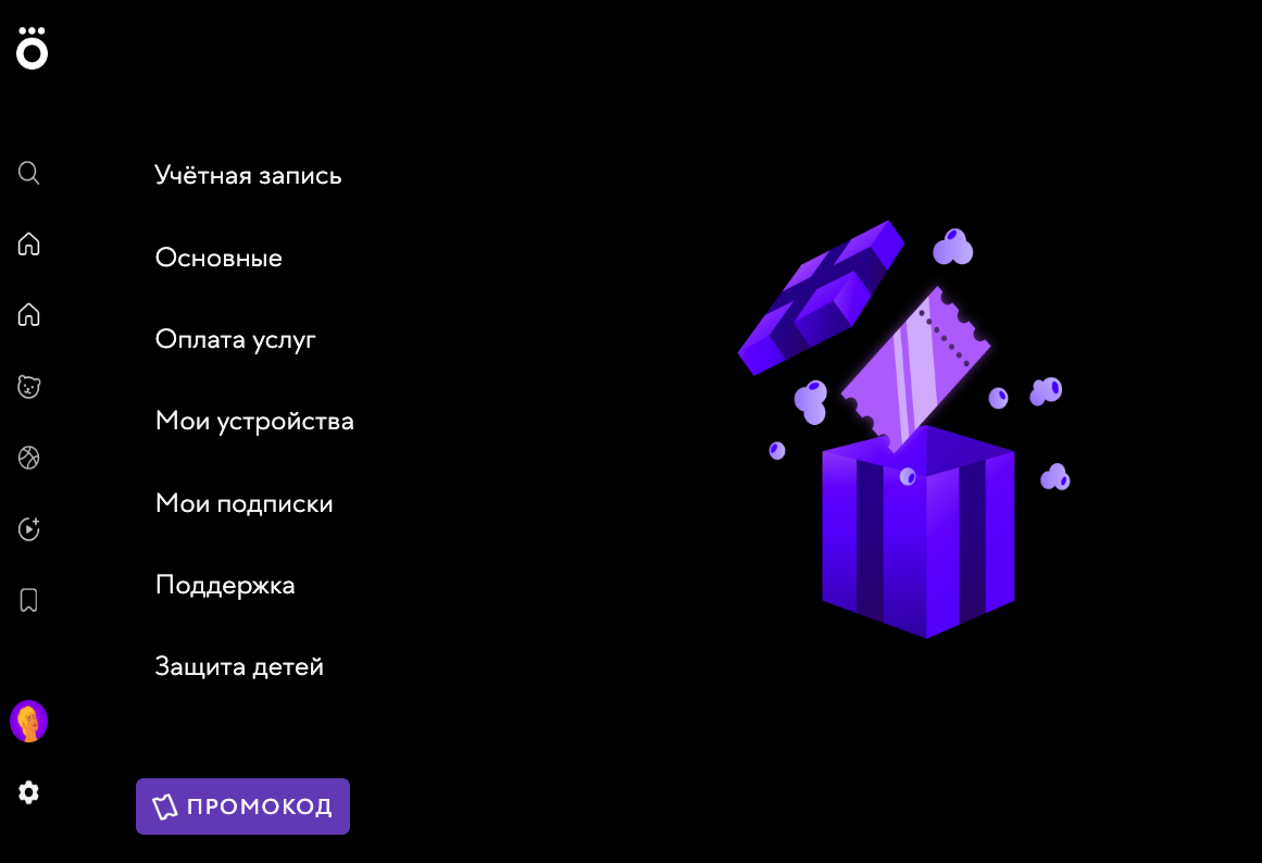 На телевизорах и приставках с новой версией приложения промокод можно активировать в профиле, в самом низу: