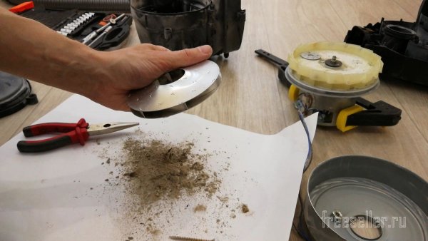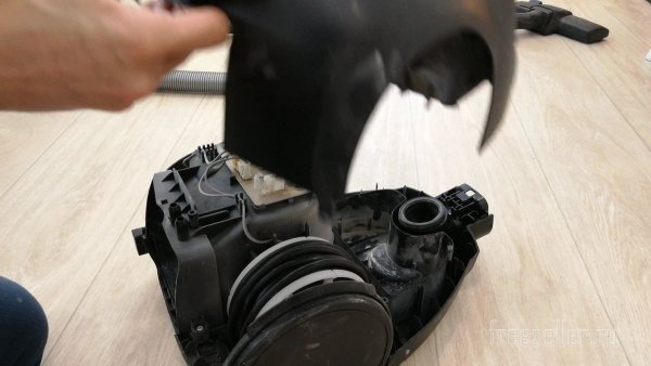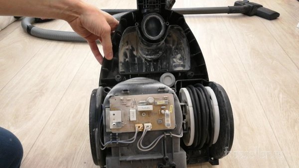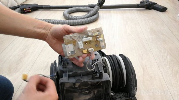 Пылесос, внутри, очень пыльный. Всю пыль нужно почистить. Пластиковые детали можно помыть под краном, а плату управления очистить сухой тряпкой.