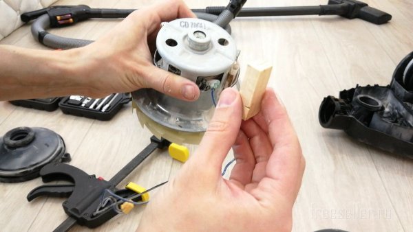 Из сосновый доски сделал два брусочка. Они нужны, что бы зафиксировать двигатель. Иначе он будет прокручиваться и гайку открутить не получится. Извлекаю щетки двигателя и вставляю на их место деревянные брусочки.