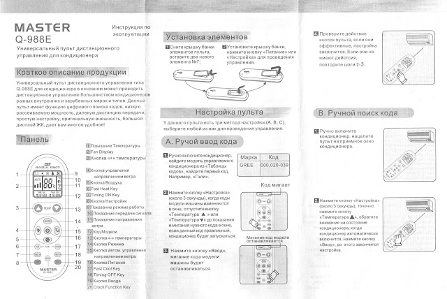 Настройка универсального пульта с помощью ручного способа — отличный выбор, если вы приобрели новый универсальный пульт, на упаковке которого указана таблица с различными числовыми комбинациями. Это коды, специально подобранные для различных кондиционеров.
