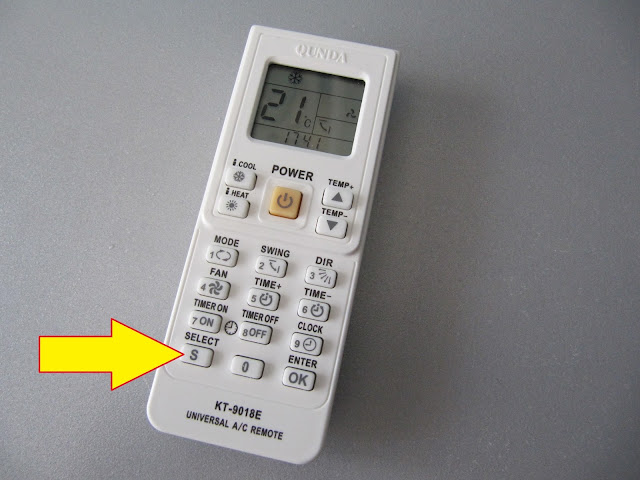 Автоматическим режимом можно воспользоваться, если вы не знаете, какой у вас кондиционер или в таблице кодов нет вашей модели кондиционера. Для настройки в режиме авто поиска необходимо взять пульт в руку и направить на кондиционер. Найдите на пульте кнопку «SELECT»,нажмите и удерживайте её в течении 5 секунд, потом отпустите.