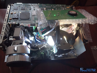 Проявилась поломка повышенным шумом при включении, отсутствием изображения и аварийным отключением проектора через некоторое время. Со слов пользователя, за некоторое время до поломки усилился шум при работе и стали искажаться цвета на изображении. Видимо, стекло стало смещаться и произошла разбалансировка светофильтра. Так что, если увидите такие симптомы, то не ждите, пока станет всё плохо. Сразу обращайтесь в сервис.
