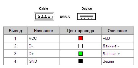 Ниже приведена таблица контактов USB с назначением разъемов, их цветов и номеров.