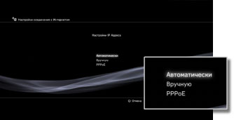 1. Подключите кабель Ethernet к системе PS3™. 2. Выберите (настройки) => (Настройки сети). 3. Выберите [настройки соединения с интернетом] . Появится предупреждение о том что инет будет отключен – выберите[ДА] 4. Появится предупреждение о том что инет будет отключен – выберите[ДА] 5. Выберите [Простые]. После подтверждения сетевой конфигурации появится список параметров. В этом списке нужно выбрать настройки соответствующему вашему типу подключения.
