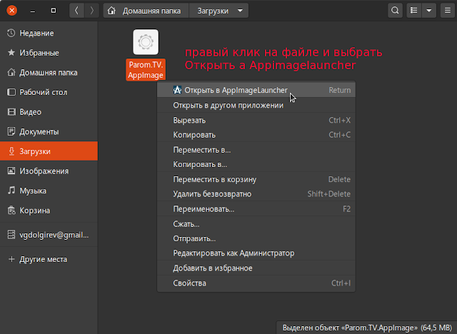 По окончании загрузки, вновь зайдите в папку с файлом. Правый клик на файле и в меню выберите Открыть в Appimagelauncher: