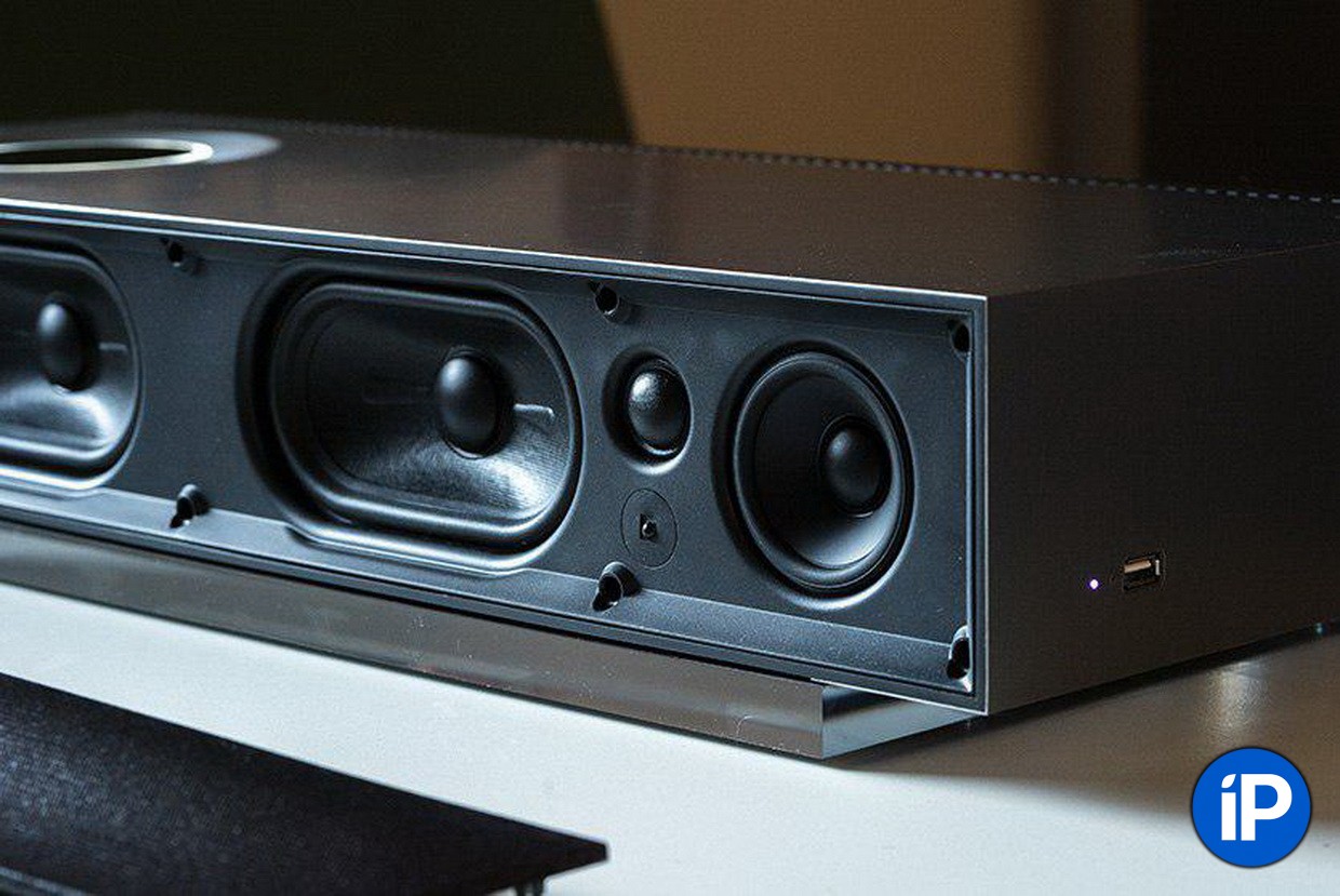 Каждый динамик подключен к собственному усилителю на 75 Вт, которые в сумме дают 450 Вт общей мощности! СЧ-динамики вынесены на края для исключения взаимоотражений, в центре установлены огромные для саундбара низкочастотники, а шелковые твитеры оказались между ними.