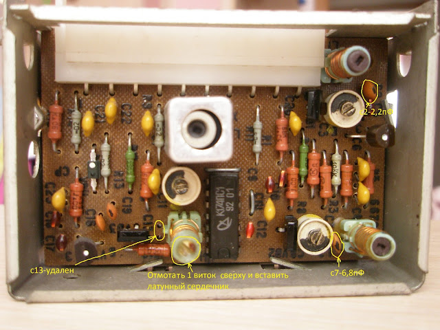 Вся перестройка блока УКВ-1-05с заключается в отматывании 1 витка с катушки L3 и вкручивании в неё латунного сердечника, уменьшении ёмкостей конденсаторов: С2 — 1,5-2,2пФ, С7 — 6,8 пФ, С13 – удалить. Далее нужно провести сопряжение контуров, путём подстройки катушек и переменных конденсаторов:
