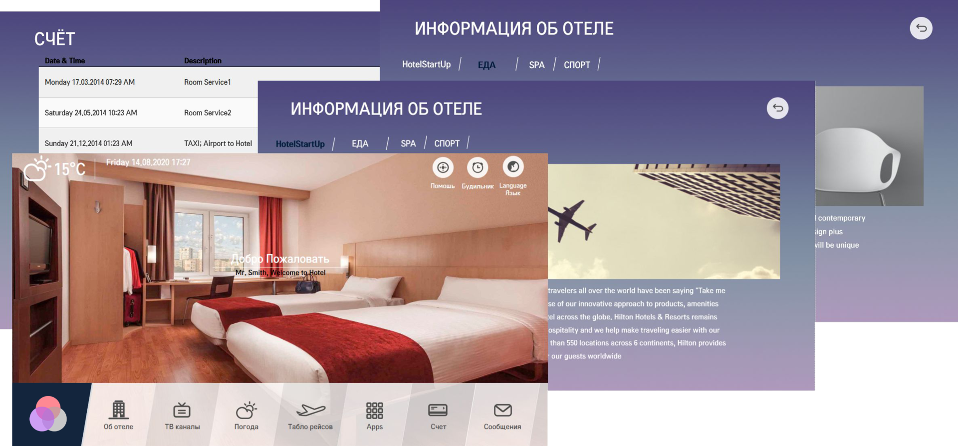 Приветствие гостя, телеканалы и фильмы, страницы об отеле и окрестностях, счет за номер и многое другое.