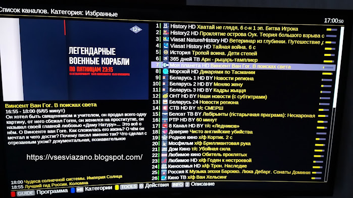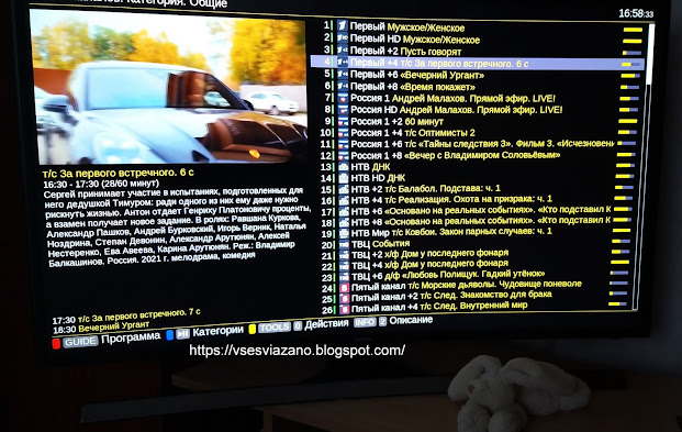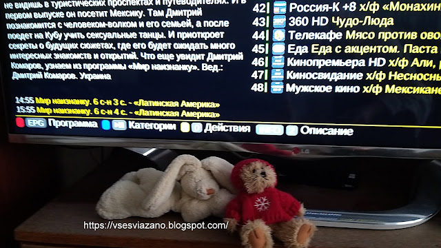 Если вы будете переставлять все 700 каналов по тематическим папкам, как сделала Фима, то после обновления ( раз в месяц — эта песня хороша, начинай сначала!) А так — уж любимые свои 50-100 каналов вы перетащите и переставите. Все действия с каналами — на строке внизу на моем фото. Ну и описание каждой передачи или фильма, время, а по красной кнопке с пульта ( или мышкой) — еще и архив! На неделю! Почти на все каналы, да!