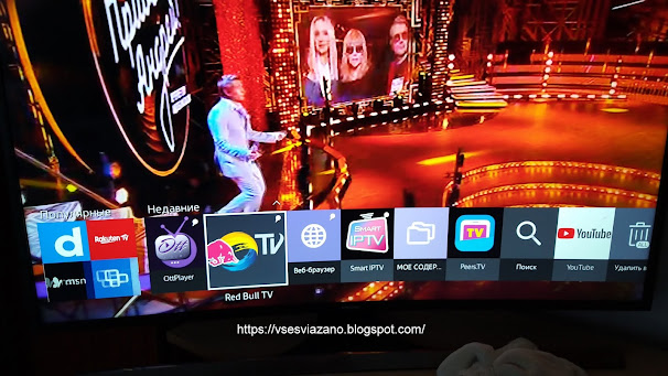 Теперь перейдем к другим маркам телевизора. Вот, к примеру, SAMSUNG, операционная система там — TIZEN. Плейер Оттплей от Алекса я поставила подменой DNS, в Самсунге тут другая программа- донор -RED BULL! Это ее нужно на Самсунге вытащить их хаба телевизора и именно она после подмены DNS откроется как Оттплей от Алекса! Вот на ней белая рамочка, смотрите!