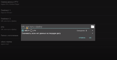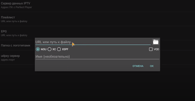 - В первом поле нужно вписать адрес M3U из биллинга. Это путь к файлу скачанного плейлиста в сети.