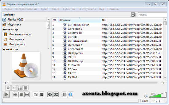 На этом скриншоте показан playlist.m3u Udpxy iptv server, который запущен через проигрыватель VLC Media Player: