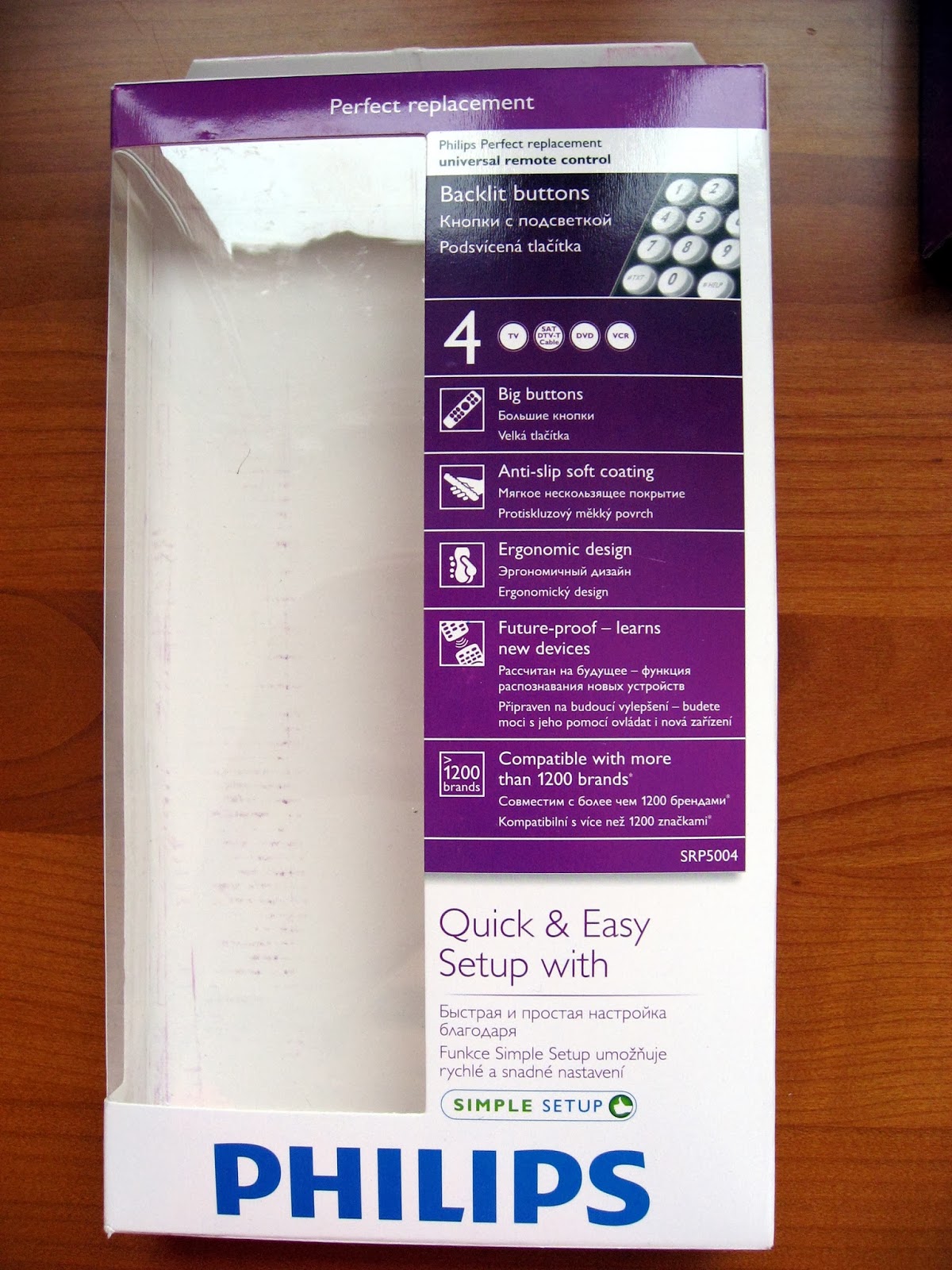 Первоначальная настройка Philips SRP5004/53 заключается в выборе четырехзначного кода производителя вашей техники из прилагаемой брошюры для каждого из четырёх устройств (переключение на соответствующее устройство осуществляется нажатием на клавиши TV, STB, DVD, VCR). Соответственно, на один пульт можно «повесить» до 4-х разных устройств.