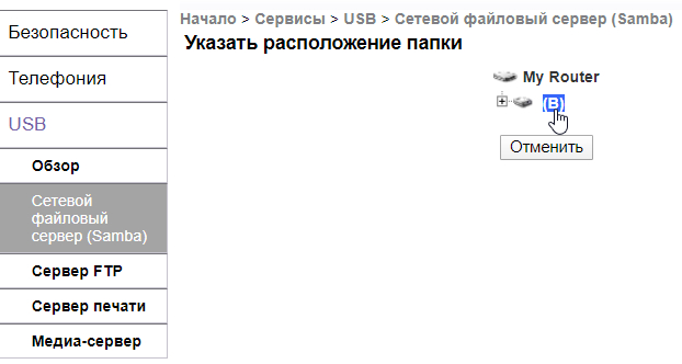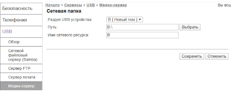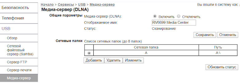 Для функционирования Медиа-сервера (DLNA) сначала нужно включить и настроить Сетевой файловый сервер (Samba).