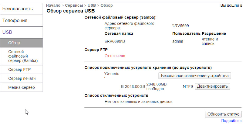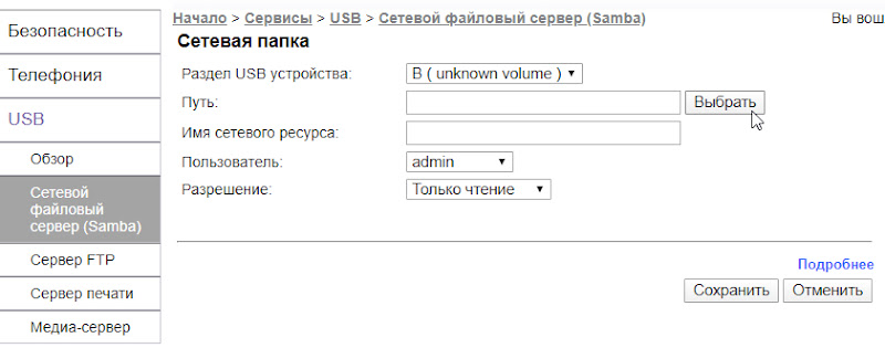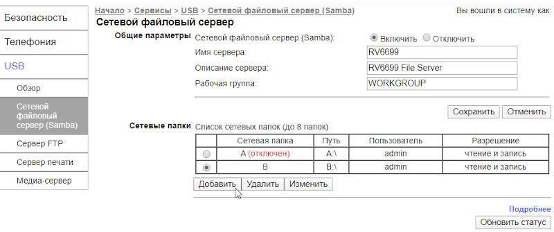 Например, <Обзор сервиса USB>отображает подключённый пустой внешний накопитель в 2 ТБайта с файловой системой NTFS, которому в ОС терминала RV6699 присвоена буква тома В. Сетевой файловый сервер (Samba) будет использовать весь внешний накопитель как Сетевую папку с той же буквой тома В, владельцем которой по умолчанию является admin (терминала) с разрешением на чтение и запись файлов в Сетевую папку. По умолчанию логин и пароль для доступа к Сетевой папке будут такими же как и для доступа к web-странице конфигурации терминала.