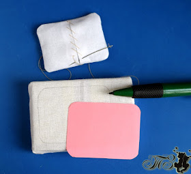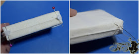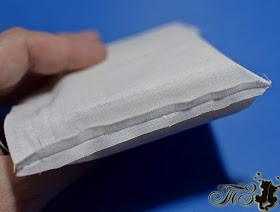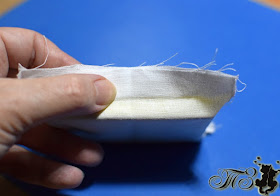 Прибавим к снятым меркам примерно по 1,5-2мм на свободное облегание коробки (т.е. чтобы удобно было одеть тканную заготовку на картонную) и по этим размерам сошьем мешочек из бязи. Прошьем мешочек по коротким сторонам. Одна из длинных сторон мешка – это сгиб ткани, другую длинную сторону НЕ зашиваем, в нее вложим картонную заготовку.