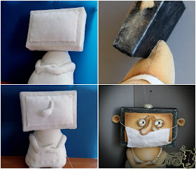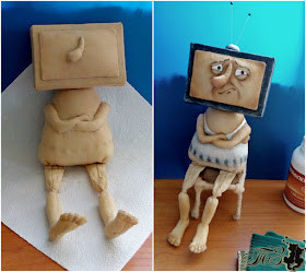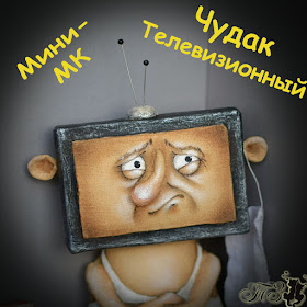 Лицо и тело Чудака Телевизионного расписано масляной пастелью (2 вида коричневого цвета – светлый и темный, и немного черной) и акрилом (белого и черного цвета). Контуры подводила коричневой гелиевой ручкой. В моих мастер-классах есть информация о том, как я расписываю игрушки масляной пастелью.