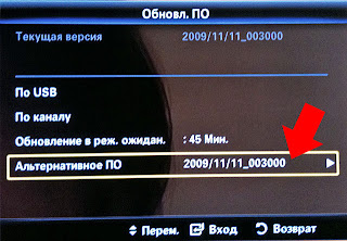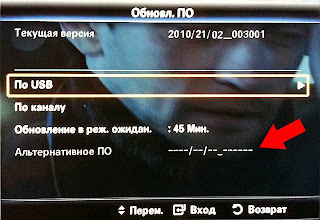 Снова возвращаемся к нашему телевизору, нажимаем кнопку на пульте MENU, затем переходим в раздел меню Поддержка > Обновл.ПО, выбираем теперь уже активную секцию Альтернативное ПО: