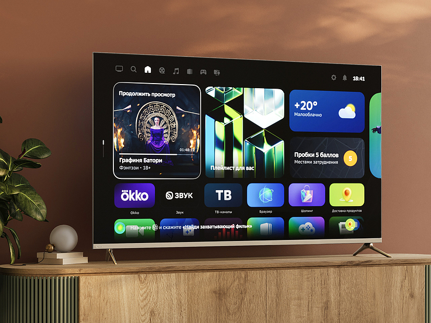 Встроенный браузер позволяет использовать ТВ и для сёрфинга в интернете. Запрос можно задать голосом, удобство навигации обеспечит виртуальный пульт в приложении Салют благодаря режимам трек-пада и аэромыши. Кроме того, с большого экрана можно заказывать продукты и еду через сервисы Самокат и Delivery Club.